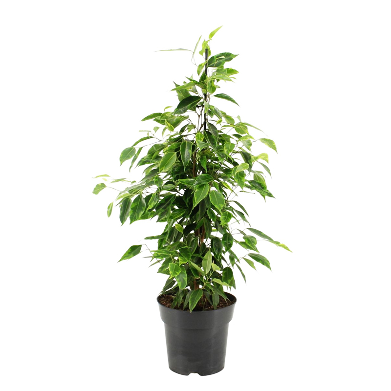 Фікус бенджаміна, як і інші фікуси, відноситься до сімейства Тутових. У дикій природі росте біля Південно-Східної Азії та півночі Австралії. Культура є багаторічником з розвиненою кореневою системою. Загальна висота рослини може досягти позначки 25 метрів, але лише у природних умовах. Деревні стебла і пагони фікуса покриті темно-сірою корою з поперечними лініями коричневого кольору. Листові пластини мають овальну форму з гострим кінцем, ростуть на стеблі по черзі, мають блискучу поверхню. Довжина кожного листа досягає 10-12 см, а ширина - 4-6 см.